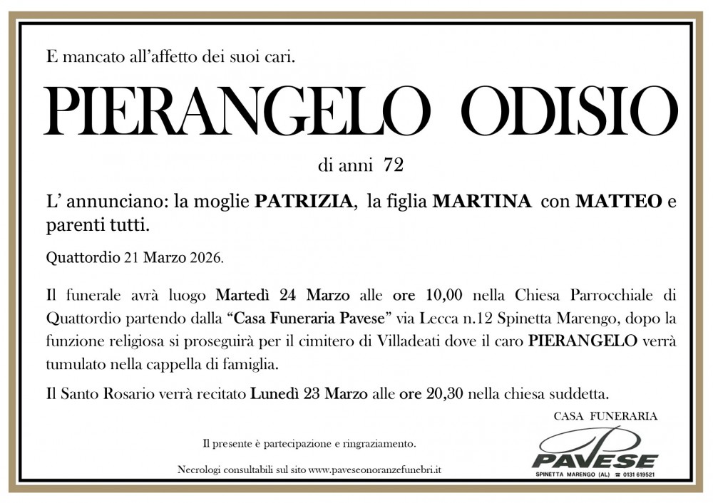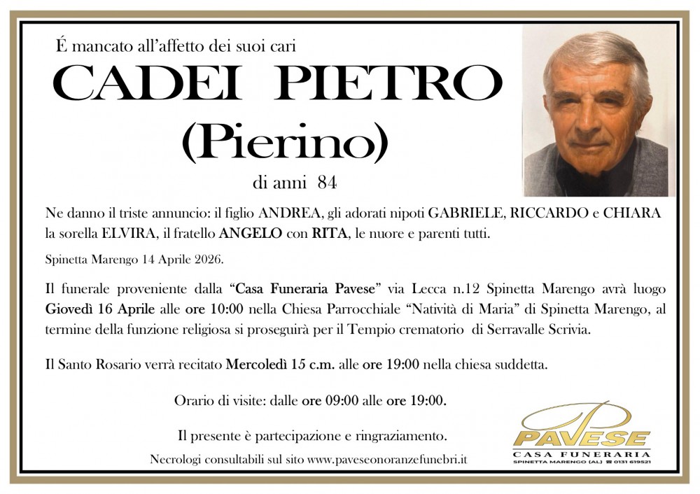Il caro Pierino sarà cremato e le ceneri tumulate nel cimitero di Spinetta Marengo
