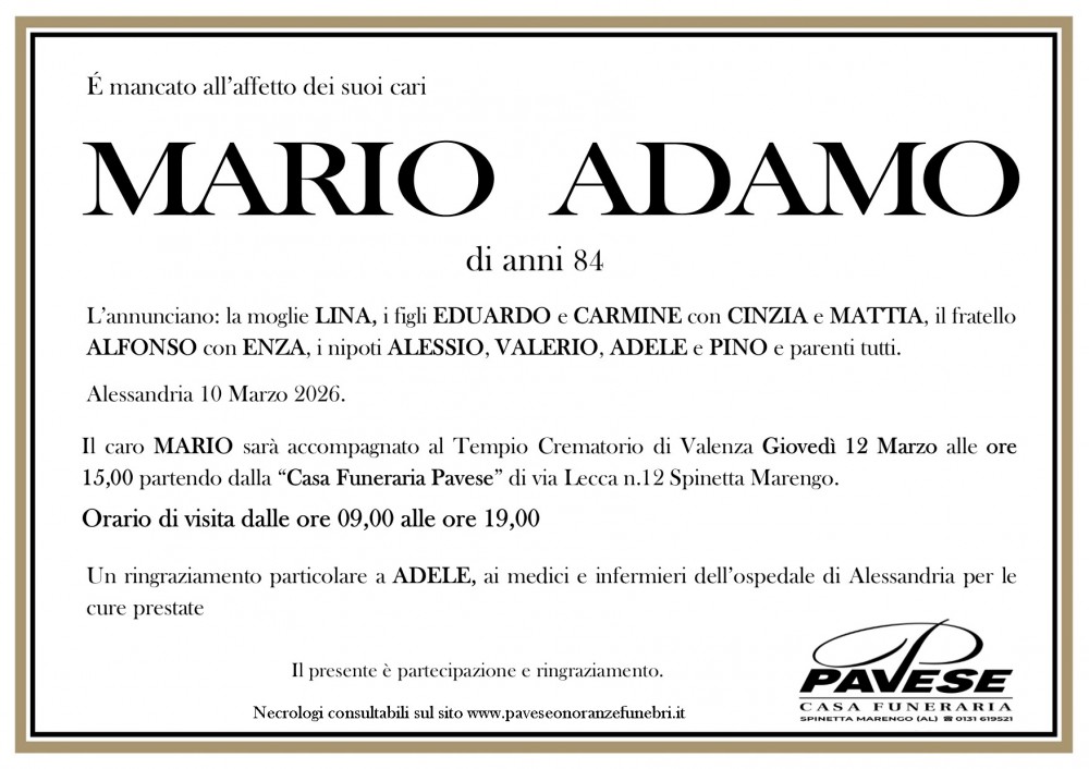 Il caro Mario sarà cremato e tumulato nel cimitero di Alessandria