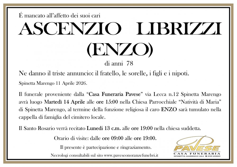 Il caro Enzo sarà tumulato nella cappella di famiglia del cimitero di Spinetta Marengo