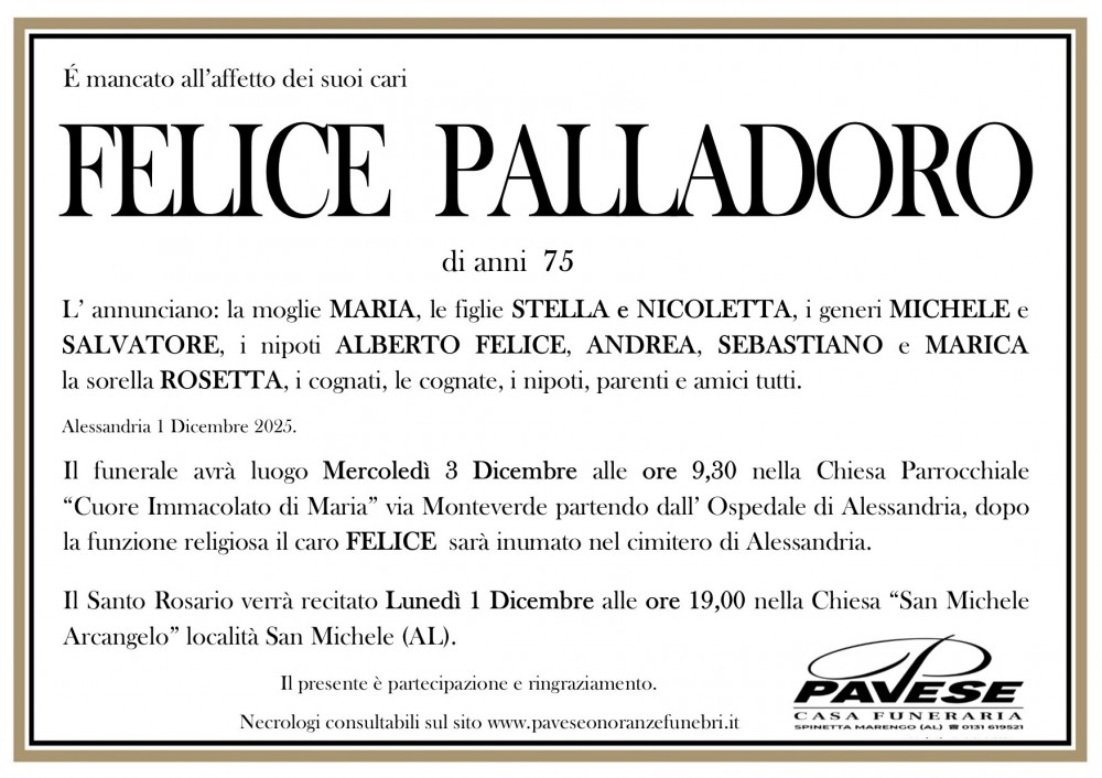 Il caro Vincenzo riposerà nel cimitero di Spinetta Marengo
