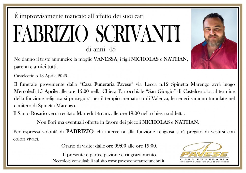Il caro Fabrizio sarà cremato e le ceneri tumulate nel cimitero di Spinetta Marengo