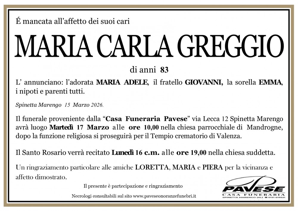 La cara Carla sarà cremata e tumulata nel cimitero di Spinetta Marengo