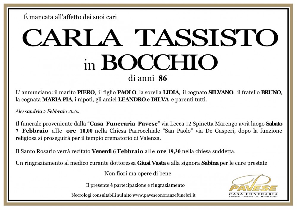 La cara Carla sarà cremata e tumulata nel ci,itero di Spinetta Marengo